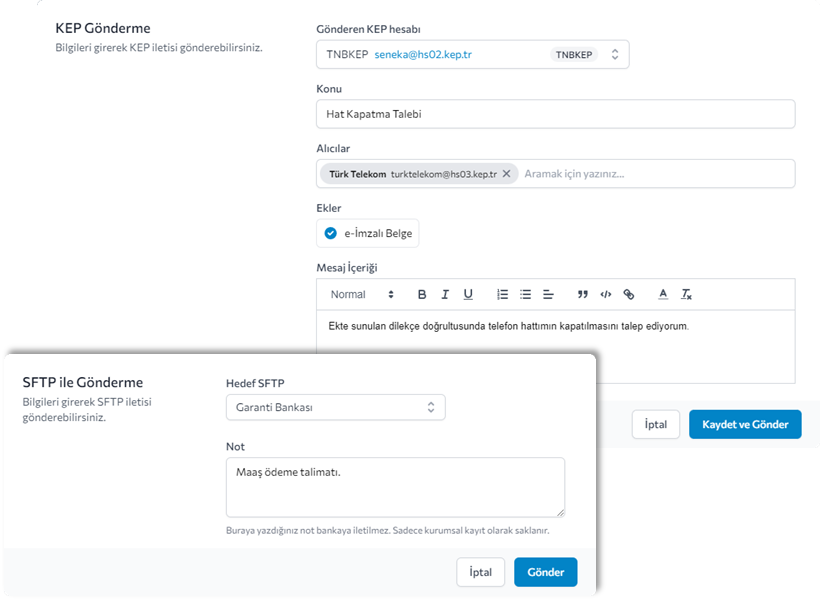 e-imzalı belgelerinizi KEP veya SFTP ile gönderin. Kurumlara göndermek üzere e-yazışma paketi oluşturun.